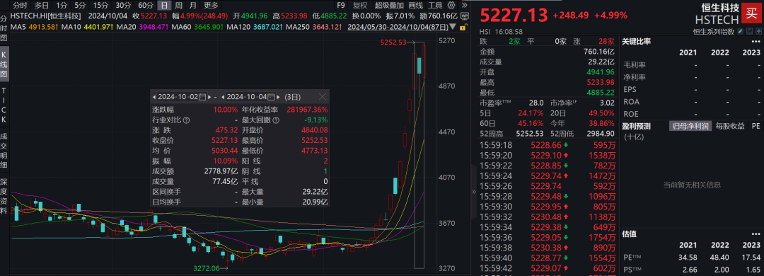 10月2日至10月4日,恒生指数累计高涨7.59%,恒生科技指数的涨幅更是高达10%。与此同期,在近期相接大涨后,港股商场的年内弘扬排到了大师主要指数首位。