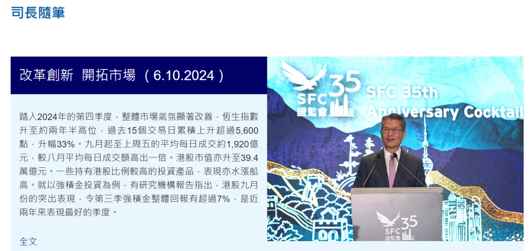 香港特区政府财政司司长陈茂波10月6日撰文暗示,举座商场脑怒显赫改善,恒生指数昔日15个往来日上升杰出5600点,升幅33%,港股市值也升至39.4万亿港元。